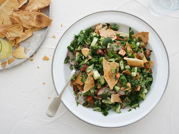 Justo antes de servir, mezcle suavemente los trozos de pan libanés.