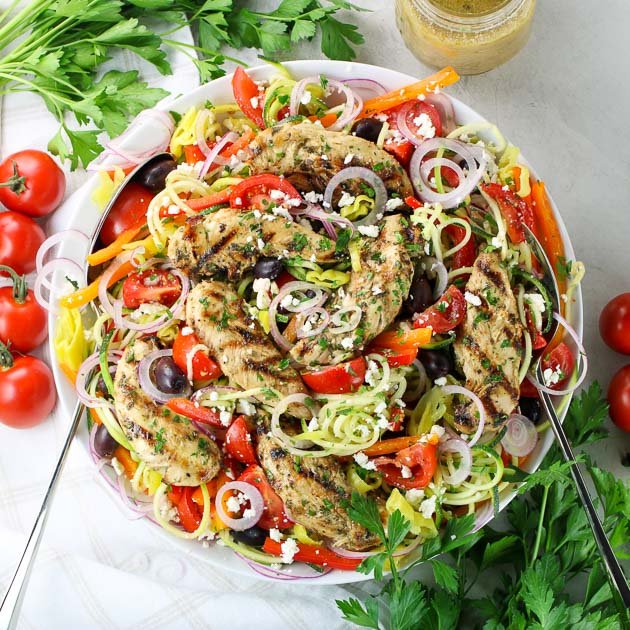 ¡Este pollo griego con fideos de calabacín es una versión hermosa y deliciosa de una ensalada de pollo griega tradicional! ¡Repleto de verduras frescas, sabroso pollo marinado a la parrilla y un aderezo casero cremoso y picante para ensaladas!