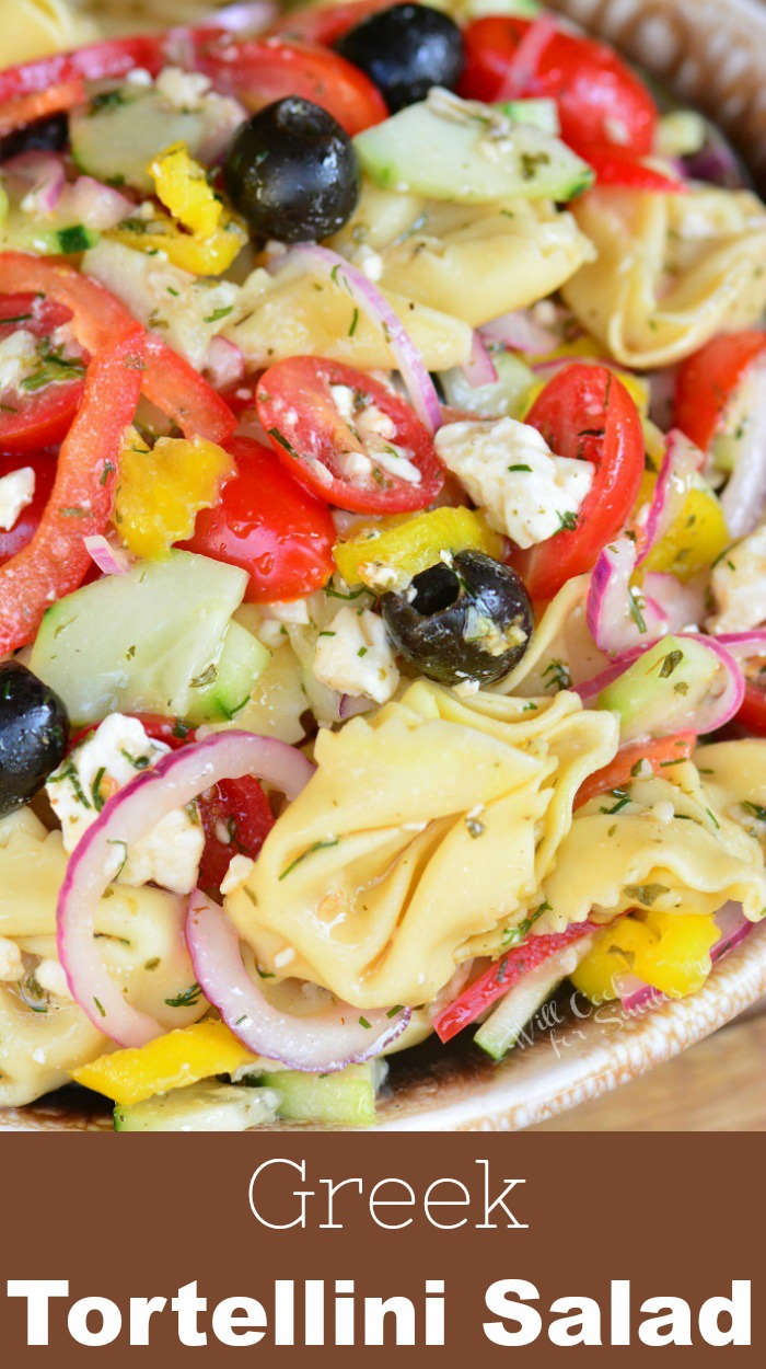 La ensalada griega de tortellini consiste en tortellini de cuatro quesos, tomates, pepinos, pimientos, cebollas, pimientos de plátano, aceitunas negras, queso feta y un aderezo griego simple. Es una maravillosa ensalada de pasta simple, llena de sabores griegos. Llévelo con usted para picnics, comidas compartidas y fiestas de barbacoa. Haga esto con anticipación y deje que todos los sabores de la salsa griega impregnen los tortellini.