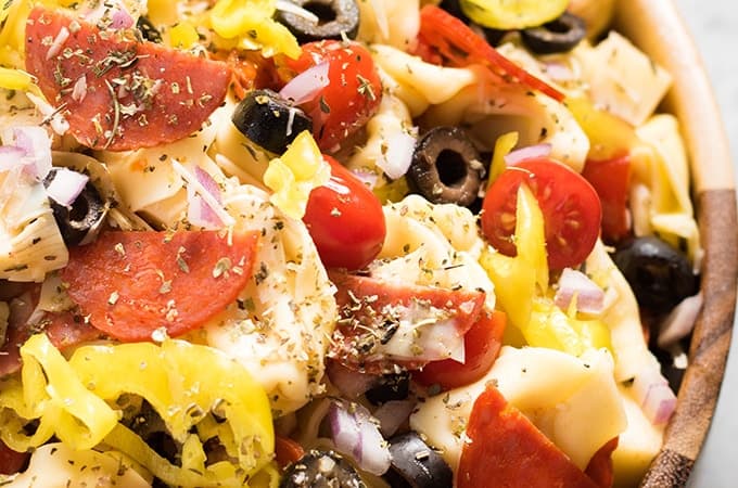 Ensalada italiana de tortellini – Esta ensalada de pasta fácil de preparar está rellena con tortellini de queso, chile, queso, verduras y aderezo italiano. ¡El complemento perfecto para las comidas de verano o una cena fácil entre semana!