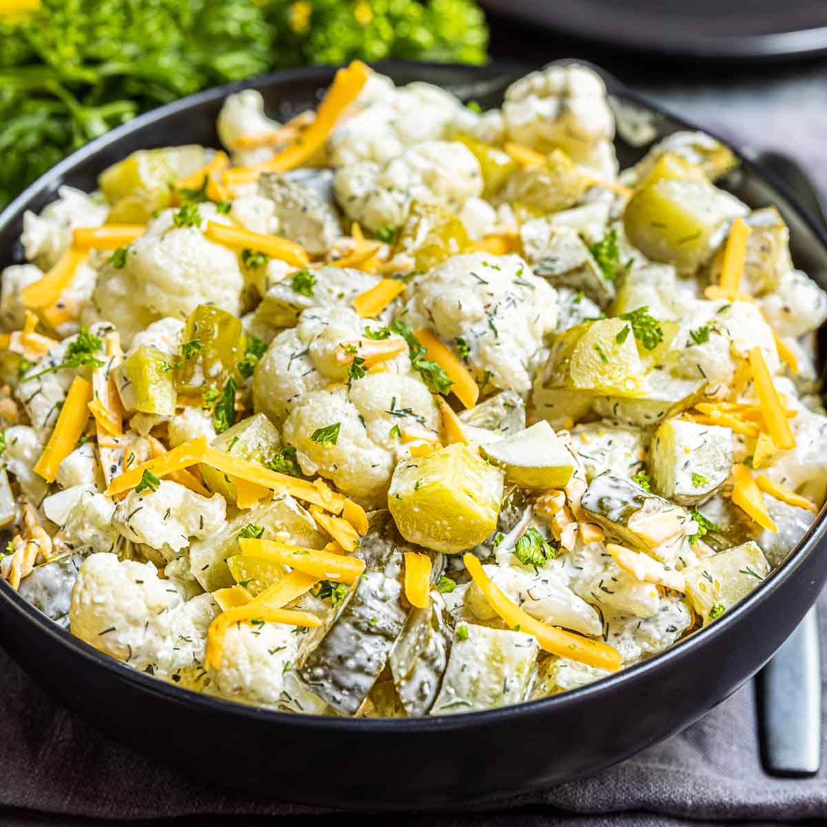 Pero los encurtidos lo son. Así que tomamos esta deliciosa receta básica y sustituimos la coliflor marinada por la pasta, tal como lo hicimos con nuestra ensalada Keto como aperitivo. Un adobo es una excelente manera de darle sabor a la coliflor (¿alguna coliflor en escabeche?). En esta receta, usamos jugo de pepinillo para marinar la coliflor y ¡GUAU, fue increíble!