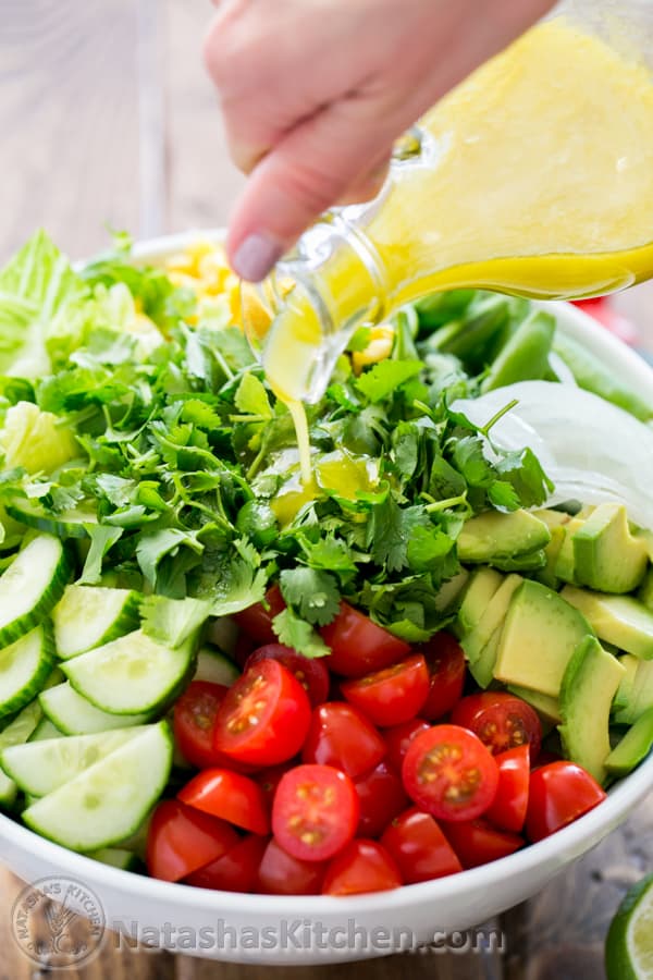 1 lechuga romana de cabeza grande, lavada, picada y seca 1 taza de tomates cherry o cherry, cortados por la mitad (o tomate grande, picado) 1 aguacate, picado 1/2 pepino inglés, en rodajas 1/2 cebolla amarilla pequeña, taza en rodajas finas guisantes, enteros, opcional 1/2 taza de granos de maíz (enlatados o recién cocidos – haga clic aquí para el tutorial de maíz) 1/3 manojo de cilantro fresco