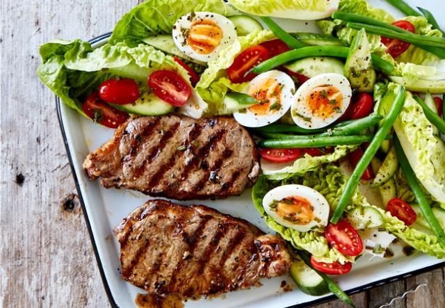 Vinagreta de hierbas: Combine los ingredientes de la vinagreta y ensamble los ingredientes de la ensalada. Cubra con la carne y los huevos y rocíe con la vinagreta.