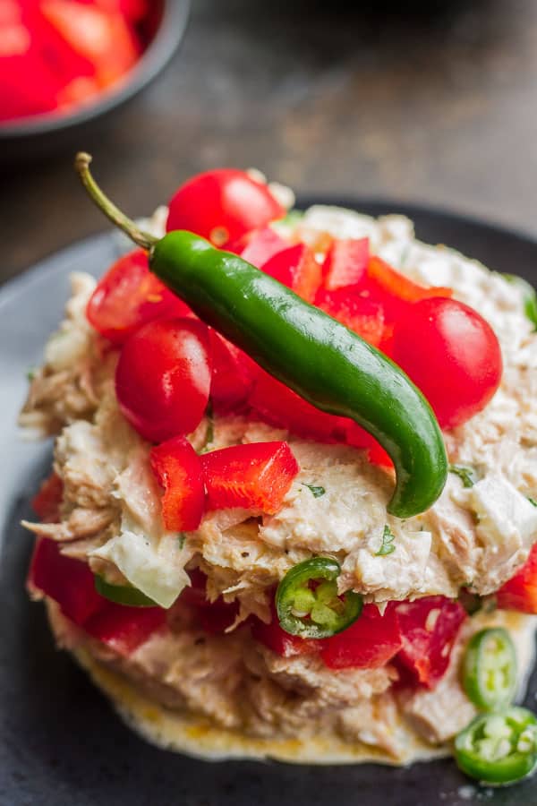 Si estoy sirviendo esta ensalada picante de atún a mis amigos, la serviré en un “tazón” de chiles (como se muestra arriba) o agregaré la ensalada con el chile picado y el serrano en rodajas. No hay más trabajo que hacer y es una forma divertida de servirle.