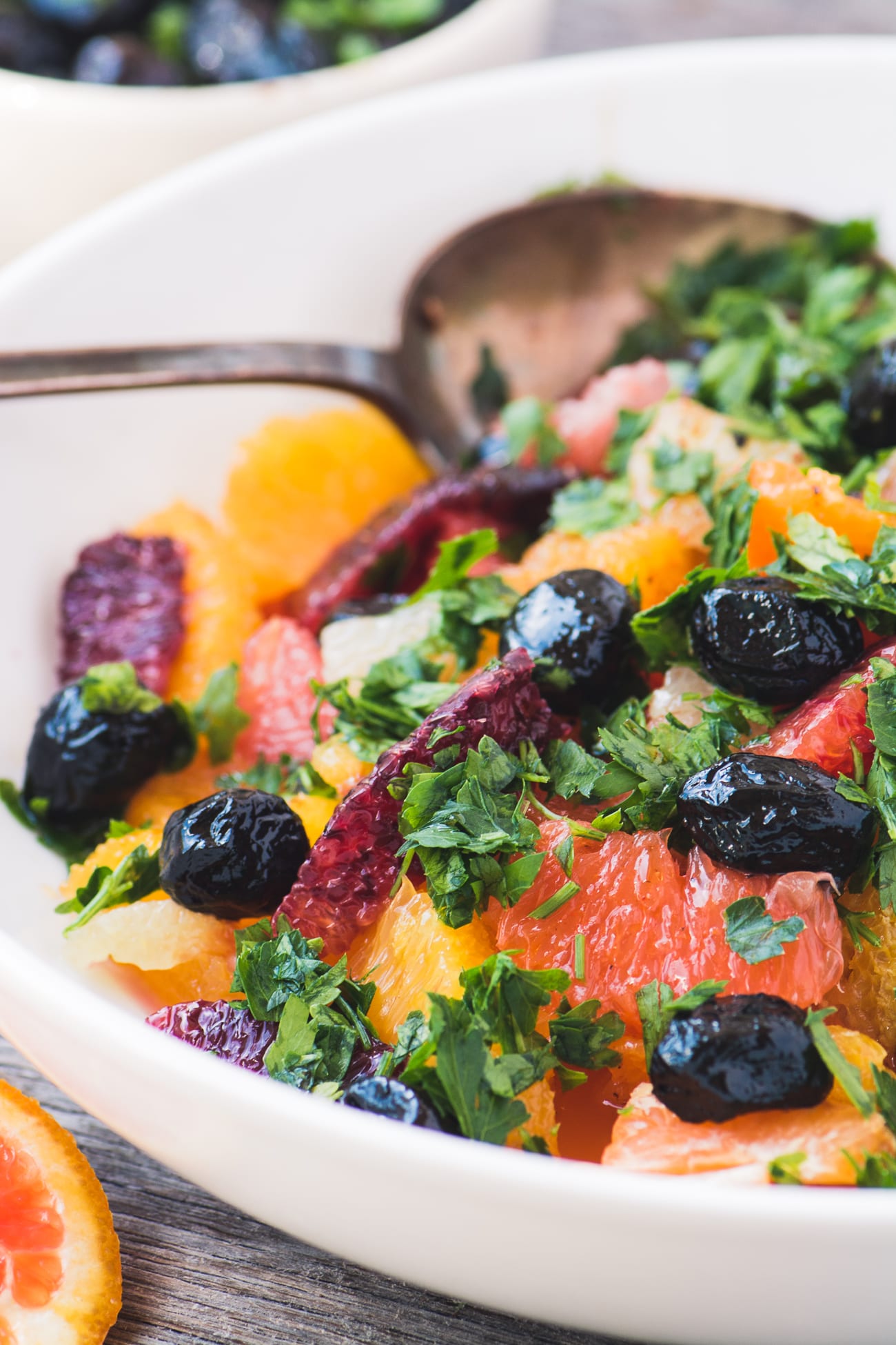 Si nunca antes ha comido una ensalada de cítricos y aceitunas, creo que se alegrará de haber encontrado esta hoy. Estos sabores no se encuentran a menudo en los Estados Unidos, pero si está familiarizado con la cocina de uno de los países que bordean el Mar Mediterráneo, desde Siria hasta Marruecos, es posible que haya tenido cítricos frescos, aceitunas verdes y ensalada de orégano. o tal vez un plato de ensalada de naranjas combinadas con dátiles y menta. Imagine un pastel de pomelo blanco con capas de hinojo fino como el papel o naranjas dulces espolvoreadas con queso feta picante. La comida en esta región soleada es deliciosa y colorida, y nadie se encoge mezclando frutas con especias y hierbas audaces. La ensalada picante de cítricos de hoy hace un guiño a esta deliciosa tradición y la hace aún más divertida y colorida al mezclar muchas variedades de cítricos.