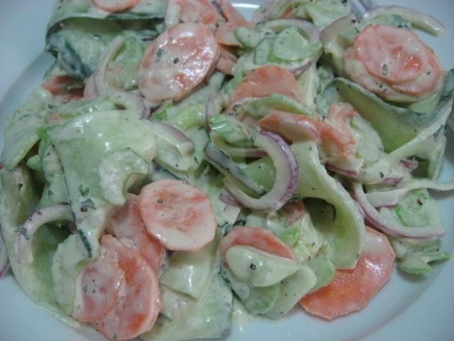 Todavía uso un rallador y uso el lado grande para cortar el pepino. Puedes usar un pelador para obtener rebanadas más finas. Servir bien y frío.