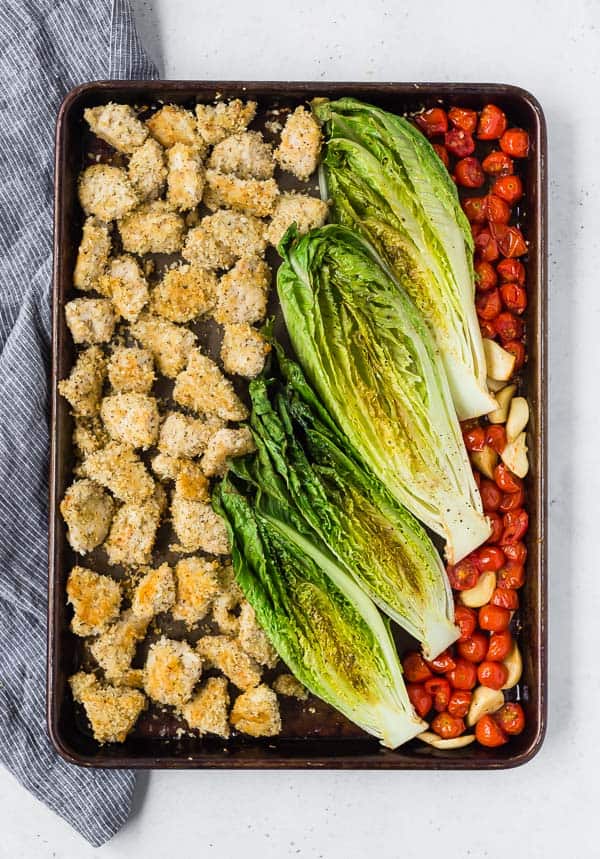 Lo convertí en una situación tipo ensalada en cuña que puede servir como una comida completa cocinando algunas otras cosas en la sartén junto con la lechuga romana asada. Hice trozos de pollo crujientes (no quiero llamarlos nuggets… ¿horno a 425ºF?