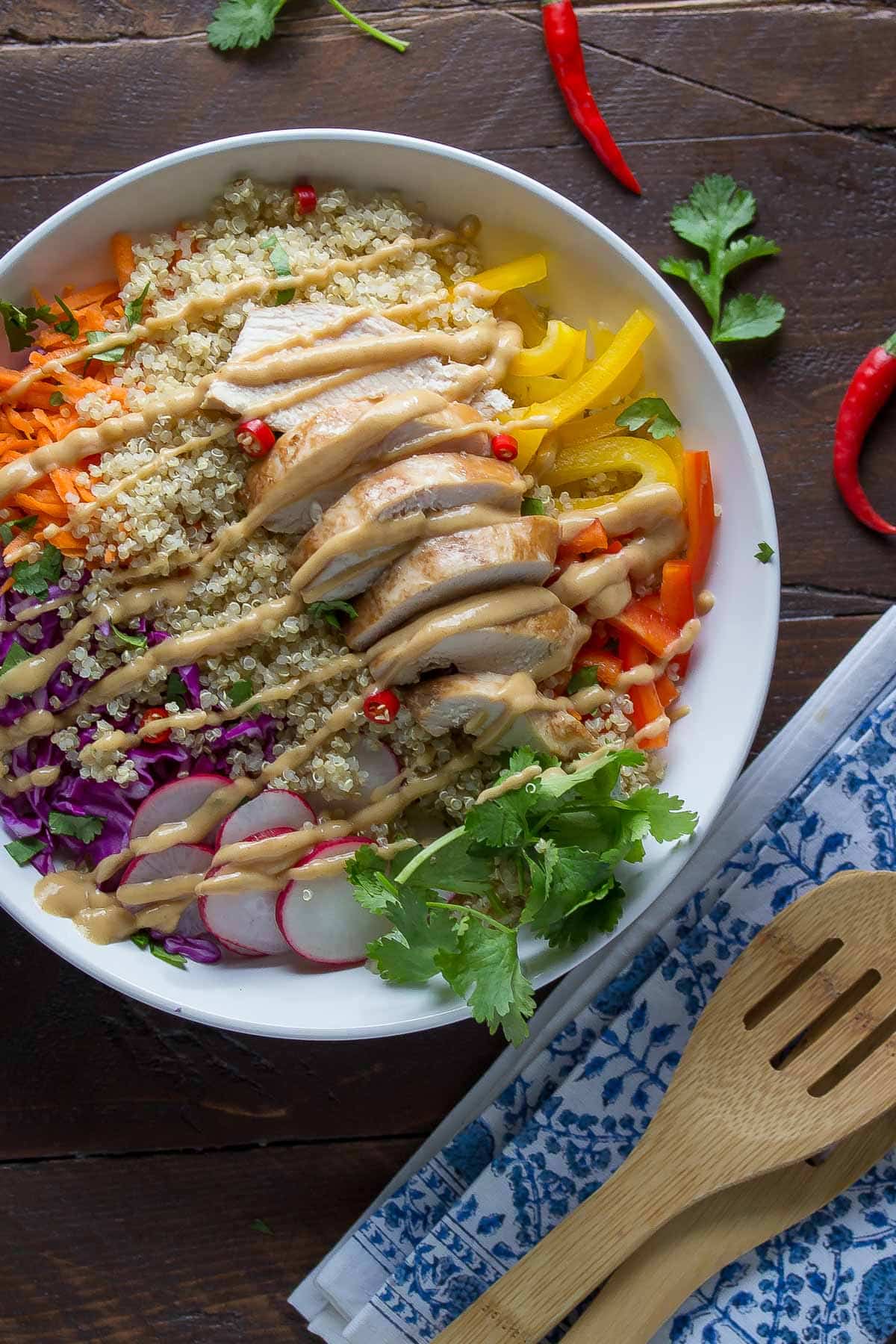 ¡Esta brillante y sabrosa ensalada de pollo con quinua tailandesa es perfecta para una cena entre semana! La quinua, las verduras crujientes y la pechuga de pollo se cubren con una salsa cremosa de maní.
