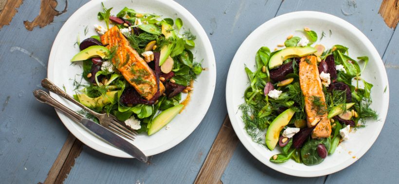 Ensalada templada de salmón y espinacas con remolacha asada, aguacate, queso feta y aceitunas