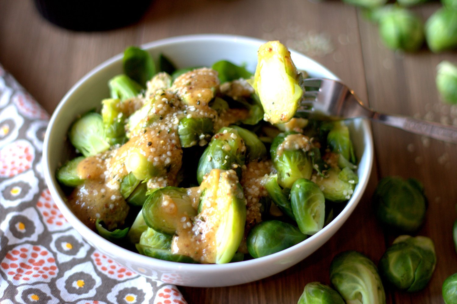 Ensalada tibia de coles de Bruselas con aderezo de miso