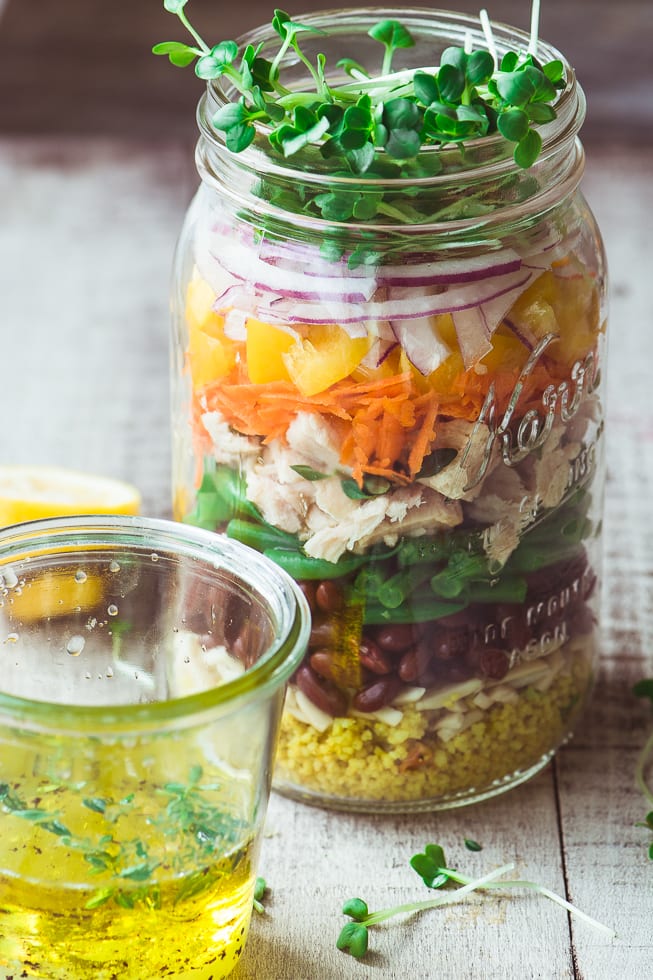 Estos frascos de ensalada de atún son más un concepto que una receta, y lo mejor es que puedes usar las sobras y cualquier otra cosa alrededor de ellas ~ el delicado sabor del atún genovés combina con casi todo. Pero comenzaré con algunas ideas en capas, que son deliciosas y duran mucho tiempo.