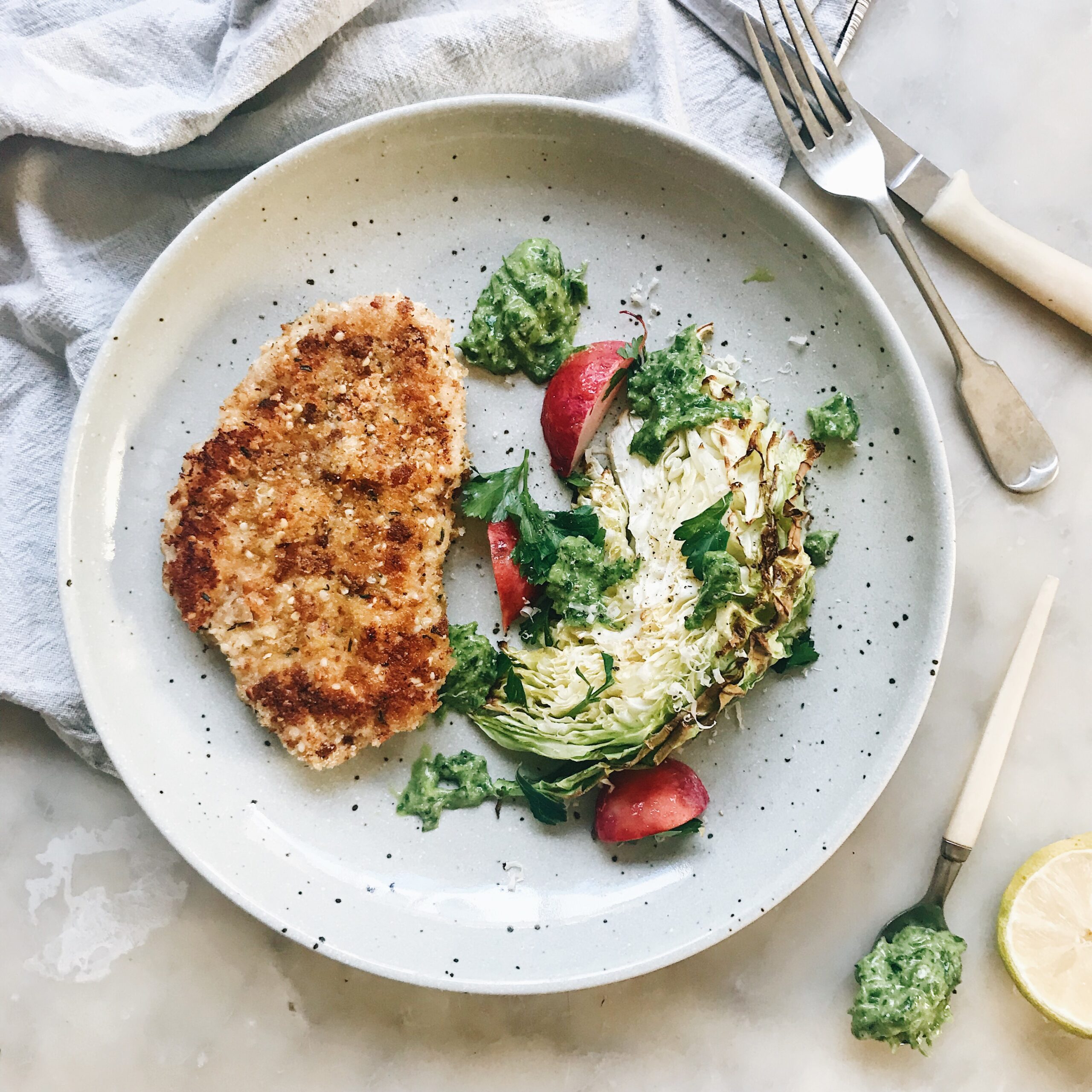 La rodaja de repollo asado que forma la base de este colinabo lleva este plato firmemente al territorio invernal. También le da mucho sabor a la col. En lugar de rallar el repollo y sumergirlo en la salsa, simplemente córtalo en trozos y ásalo hasta que esté dorado y crujiente en los bordes. Cuando esté caliente y dorado, agregue un poco de vinagre y rocíe con el aderezo de hierbas y su repollo cálido e invernal estará listo.