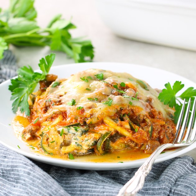 Esta deliciosa cazuela comienza con fideos de calabacín rociados con salsa marinara, luego una capa cremosa con ricotta y queso crema, más fideos de calabacín y perejil, luego una capa con carne picada y marinara, todo cubierto con un poco de mozzarella, ¡mmm! !