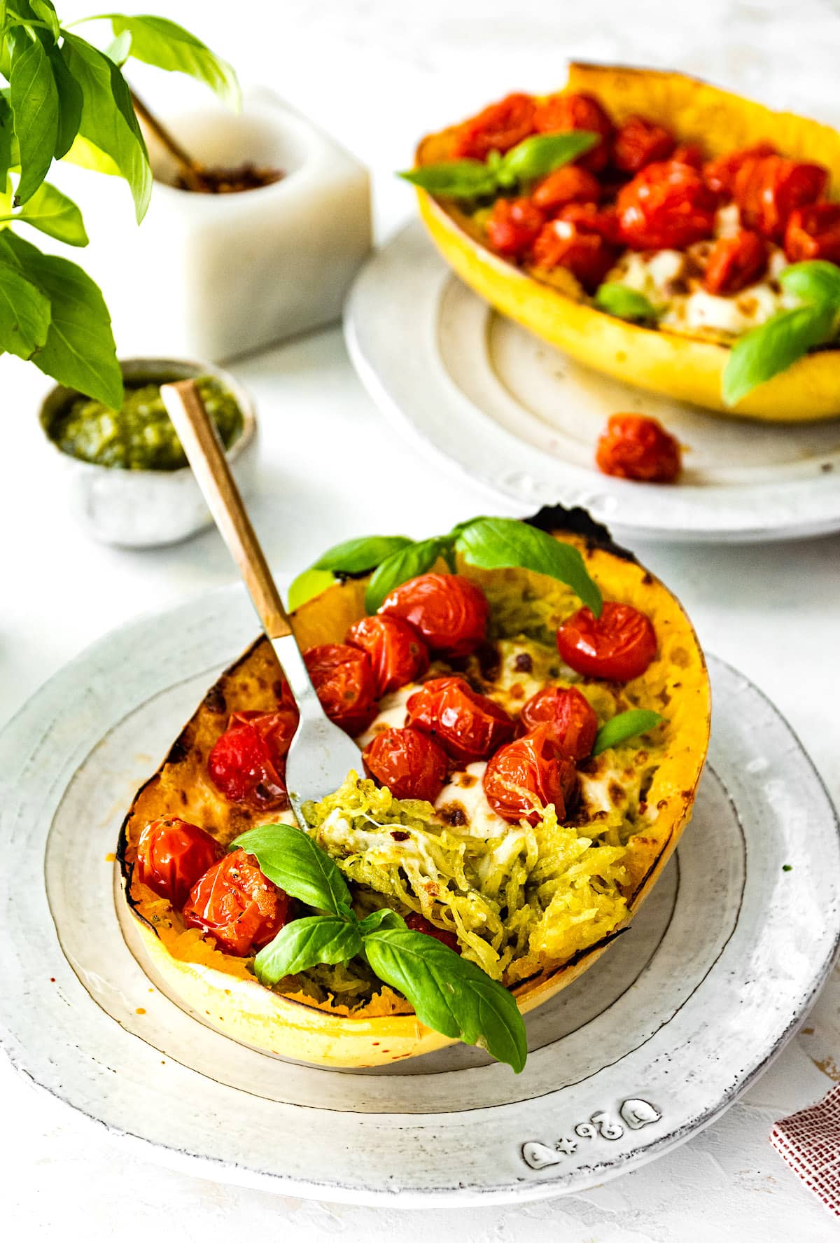 Si aún no has probado los espaguetis con calabaza, te recomiendo que pruebes con esta receta de espaguetis con calabaza. Cada vez que hago esto, recibo elogios… ¡incluso de los niños! Espaguetis de calabaza con pesto, mozzarella fresca y tomates asados ¡Es un ganador de la cena!
