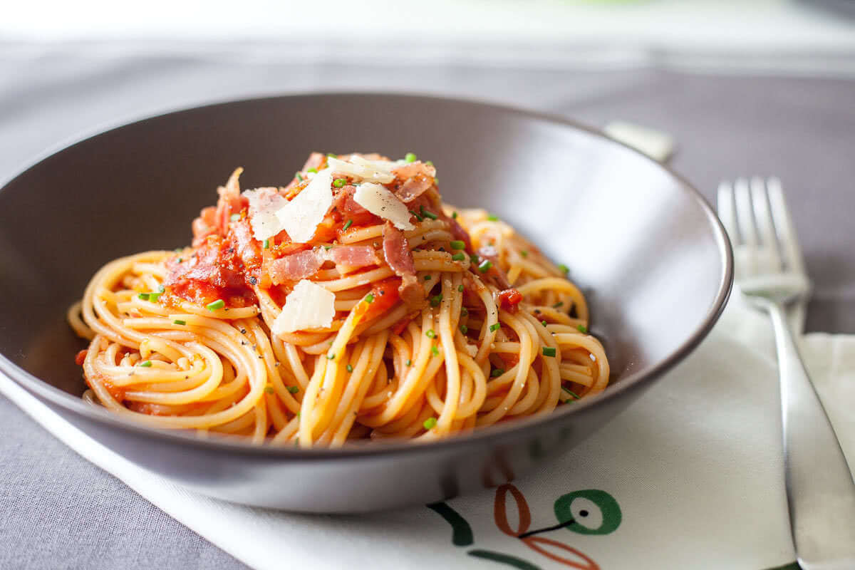 La famosa salsa Amatriciana es una salsa tradicional italiana para pasta elaborada con guanciale (carilleras de cerdo curadas), queso de oveja y tomate.