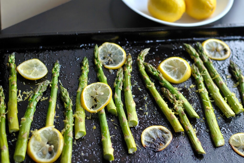 Precalentar el horno a 350 grados. Rompe el tallo leñoso de los espárragos. Espolvorea una sartén con pam y coloca los espárragos en la sartén de la misma manera. Coloque los limones en rodajas finas alrededor de los espárragos. Rocíe con aceite de oliva y coloque en el horno con las puntas florales hacia usted para que las otras puntas estén en la parte posterior y más caliente del horno. Cocine por 15 minutos o hasta que desee. (Nos gusta mucho nuestro traje) Retirar del horno y exprimir el jugo del segundo limón por todas partes. Espolvorea con la ralladura, la sal de ajo y la pimienta blanca. servir inmediatamente