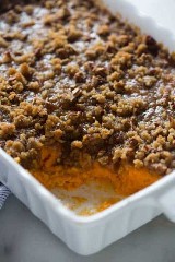 Saltar: Puedes preparar la cazuela de camote con 1 o 2 días de anticipación. Prepara primero el relleno y aplástalo en la sartén. Luego haga la salsa, pero en lugar de ponerla en la sartén, póngala en una bolsa ziplock. Cuando estés listo para cocinar la olla de camote, sácala del refrigerador y espolvorea con la salsa. Luego hornee a 350 durante 35-40 minutos.