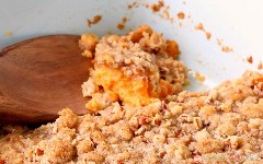 - En un tazón mediano, mezcle la harina, el azúcar moreno y la mantequilla hasta que se desmoronen. Agregue las nueces a la mezcla de harina. Espolvorea la mezcla de harina sobre la mezcla de camote/papa.