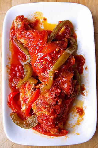 Pollo con pimientos rojos y verdes en una sencilla salsa de tomate.