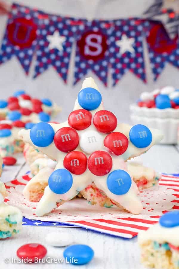 Estas estrellas Rice Krispie Treat del 4 de julio son un regalo divertido con M&M patrióticos. Haga estas golosinas sin hornear para sus picnics o barbacoas del 4 de julio.