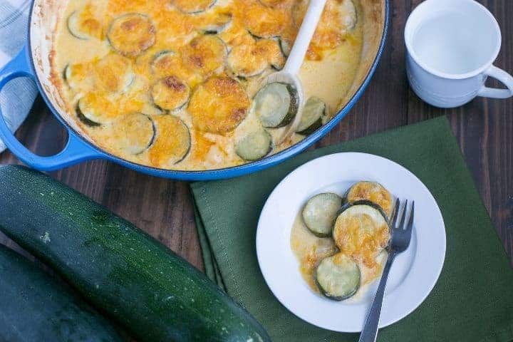 Un plato gratinado tradicional se cubre con pan rallado y queso. Luego se cocina hasta que esté perfectamente dorado. Pero usar calabacín y omitir la cobertura crujiente lo convierte en un fantástico plato de acompañamiento bajo en carbohidratos.