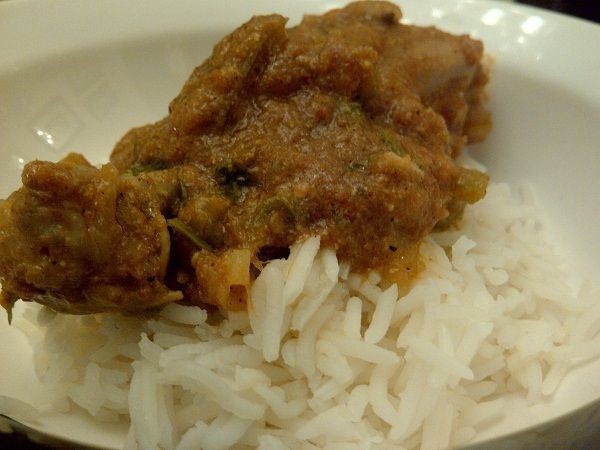 Como nos gusta nuestro curry picante, agregué 2 chiles. Agregué una pizca de cúrcuma a la olla arrocera que produjo arroz caliente, ahumado y teñido de naranja. Los papadams son un buen acompañamiento.