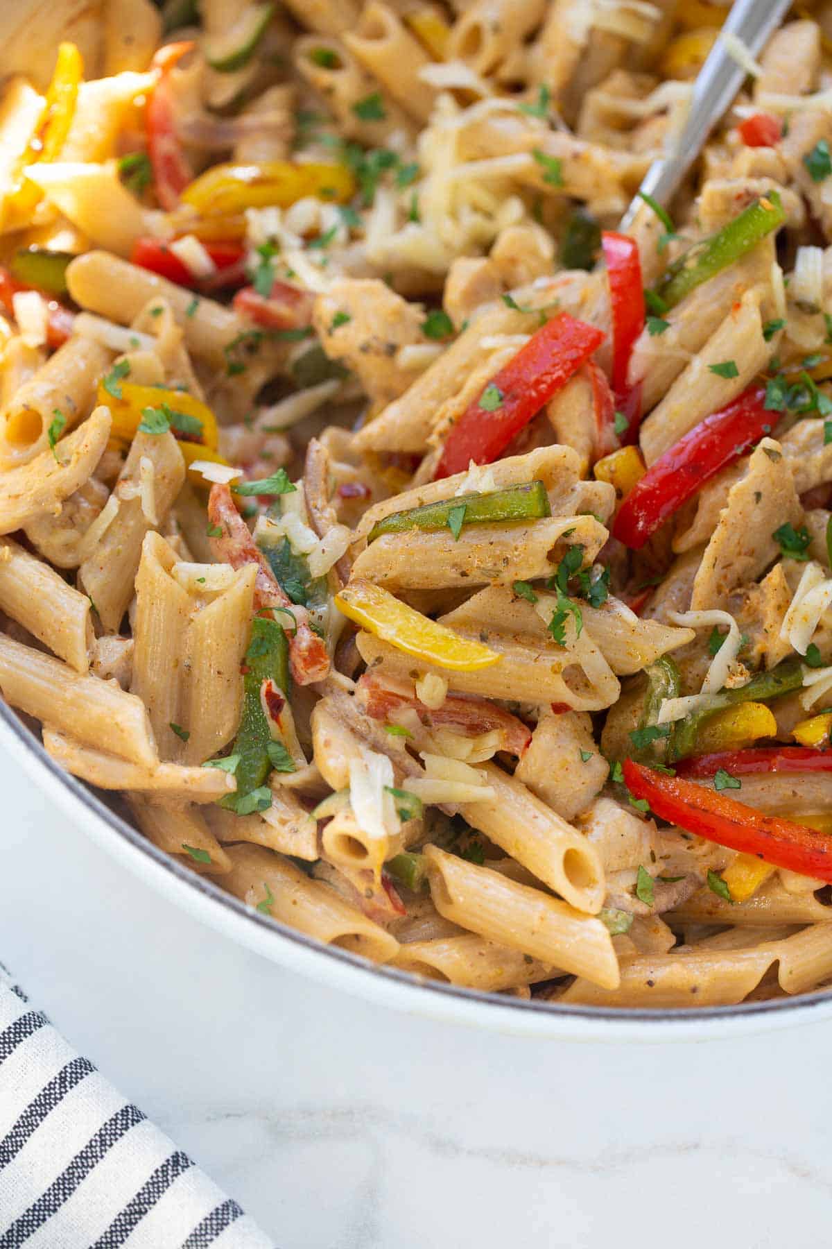 La próxima vez que necesite una cena rápida, ¡pruebe esta pasta de fajita de pollo sin gluten! Es cremoso, sabroso y abundante, y es una gran comida para cualquier ocasión.