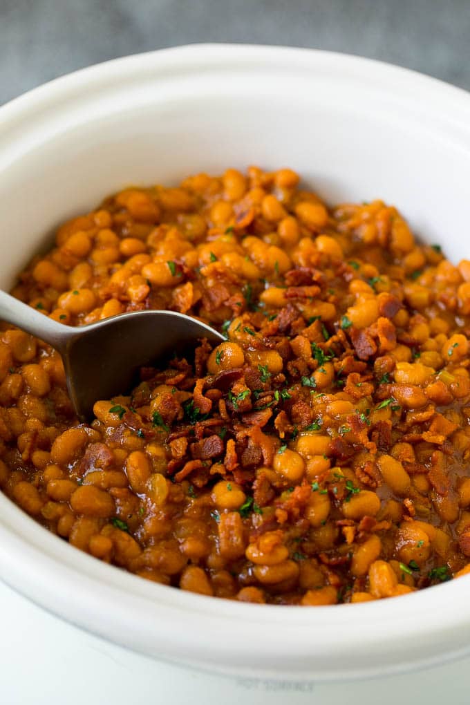 Estos frijoles horneados son una combinación de frijoles suaves, tocino y salsa dulce y salada, todo cocinado en la olla de cocción lenta. Una guarnición súper rápida y fácil que es perfecta para cualquier barbacoa o reunión de verano.