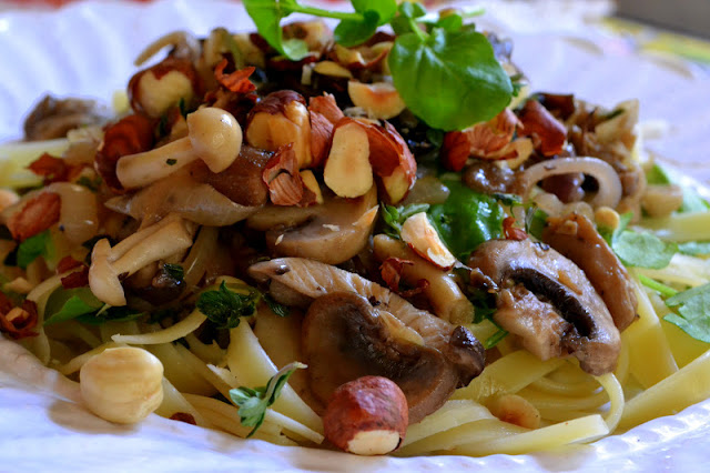 Fettuccine con champiñones y avellanaspara 4 personas12 onzas de Fettuccine 4 cucharadas de mantequilla 1 cebolla dulce, cortada por la mitad y en rodajas al menos 4 tazas de champiñones silvestres o exóticos en rodajas 1/2 taza de jerez seco, marsala o vino blanco seco 1/2 taza de caldo de pollo (opcional) pimienta recién molida varias ramitas de tomillo fresco, sin hojas 1 manojo de berros picados 1/2 taza de queso gruyère rallado 1/2 taza de avellanas tostadas, picadas en trozos grandes