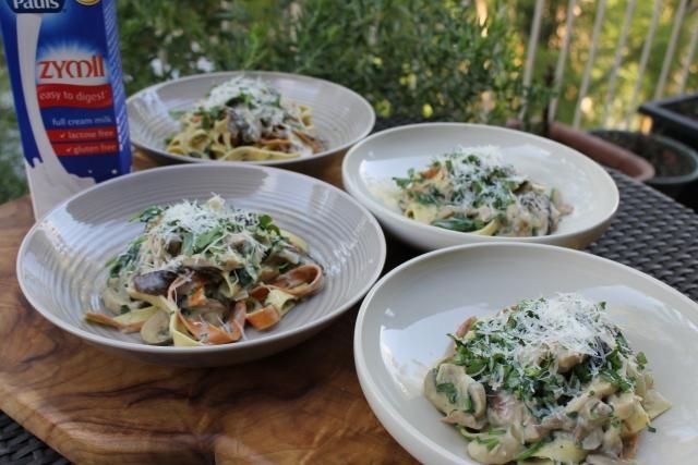 Escurra la pasta y agréguela a la mezcla de champiñones y mezcle, sirva de inmediato, decore con parmesano y perejil y ¡disfrute!