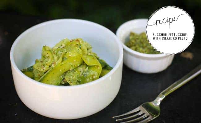 Combiné la “pasta” con pesto de cilantro porque me encanta el cilantro y suele ser más barato que la albahaca. ¡Y no hay queso!