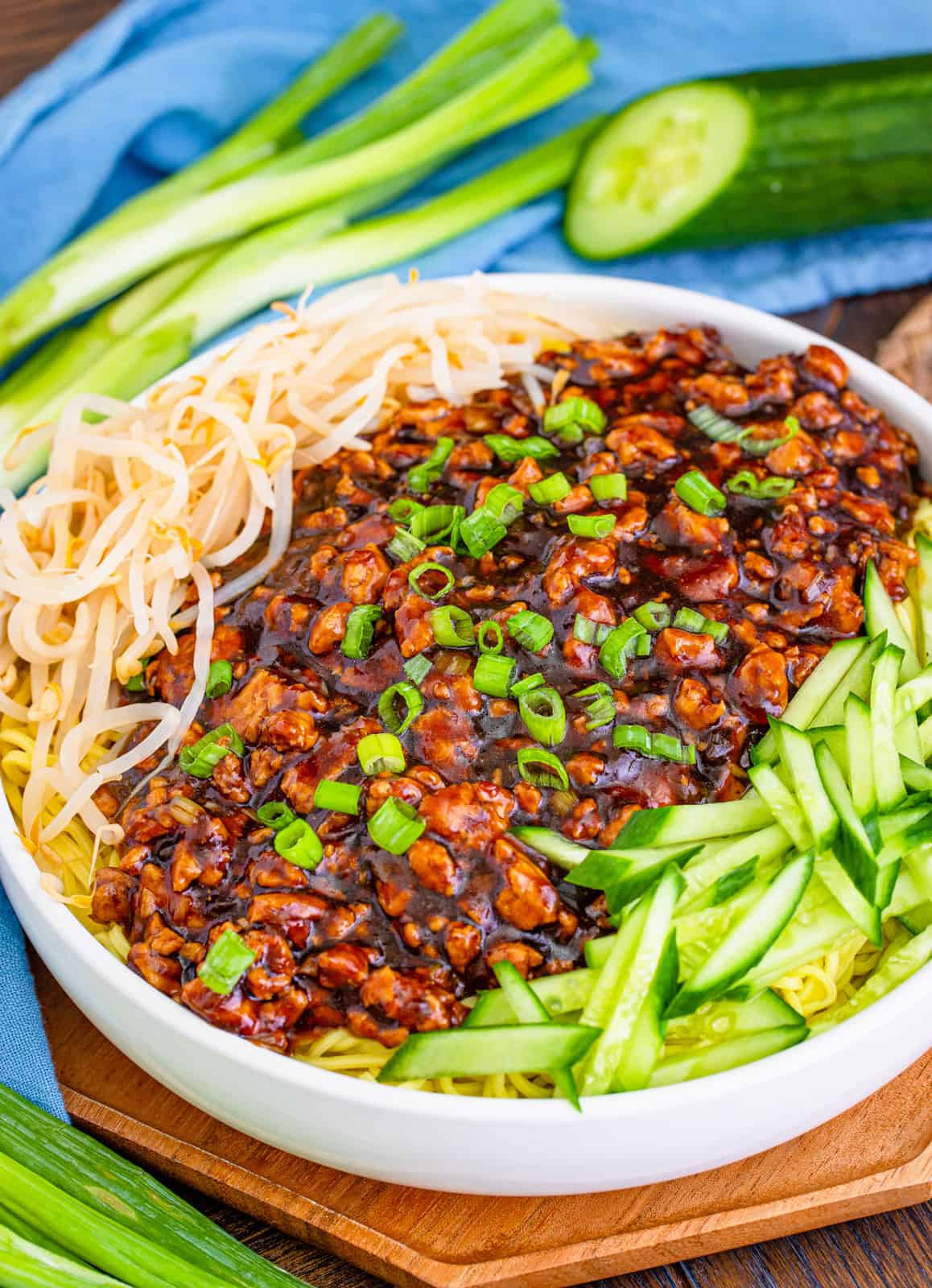 - Vierta los fideos en un tazón grande y vierta la salsa sobre ellos. Adorne con cebollas verdes, pepino y brotes de soja. Servir inmediatamente.