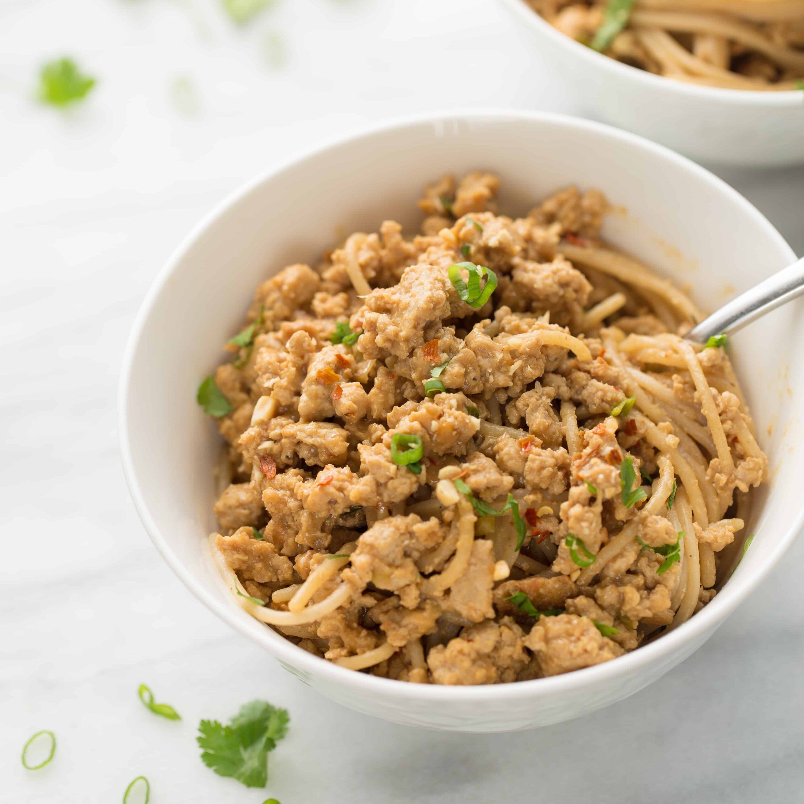 Hago esta versión de fideos Dan Dan con pavo molido para aligerar un poco las cosas. También uso espaguetis sin gluten (mi marca favorita es Jovial) y nunca se sabe.