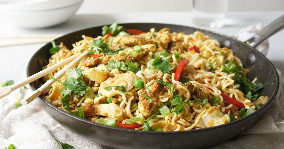Freír la carne de cerdo en el aceite restante durante unos 5 minutos, agregar los fideos y mezclar, mezclar las verduras y calentar.