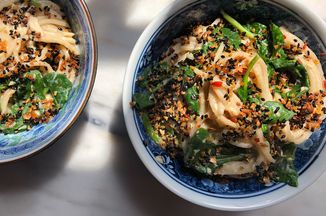 Cocine los macarrones de acuerdo con las instrucciones del paquete. Escurrir los espaguetis e inmediatamente devolverlos a la sartén (no enjuagar). Agregue aproximadamente 3/4 de la salsa, revolviendo hasta que los fideos estén cubiertos de manera uniforme. Agregue las espinacas, revolviendo unas cuantas veces más hasta que se marchiten, luego el atún. Agregue la salsa restante, si lo desea. De nuevo, pruebe la sazón y el equilibrio; agregue un poco de sal o un poco de salsa de soya o aceite de sésamo (tostado o simple) para aligerar los sabores si es necesario.