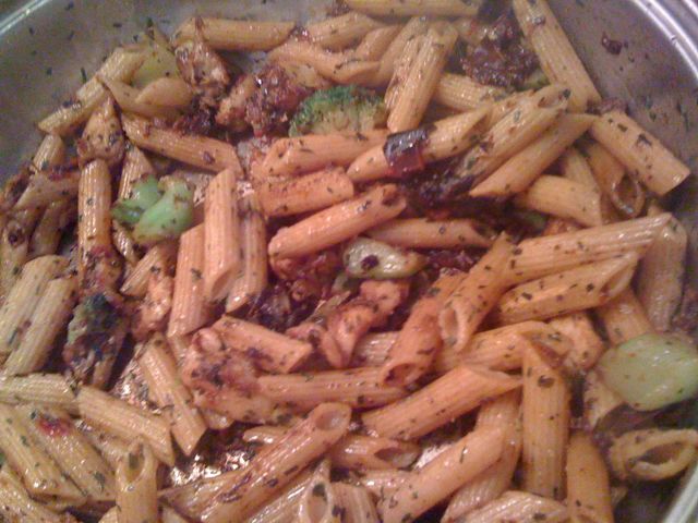Poner media cucharadita de aceite de oliva en la sartén y se colocará el pollo encima. Mientras el pollo se calienta, agregue los fideos. La masa de trigo tarda mucho más en cocinarse, así que dale algo de tiempo. Cortar el pollo en trozos medianos y agregar el brócoli. Mezcla todo, asegurándote de descongelar el brócoli. Cuando la pasta esté cocida, escúrrala y colóquela en la sartén con el pollo y el brócoli.