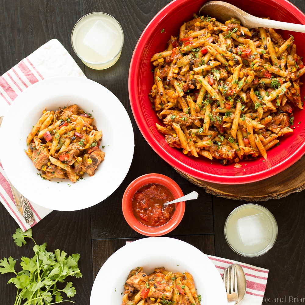 La pasta es una opción de cena tan fácil y me encanta que Dreamfields sea un poco más saludable con 5 gramos de fibra y 7 gramos de proteína por 1 taza de pasta cocida. Además, sabe igual que la pasta normal. Hice algo un poco diferente con este plato de pasta con taco de pollo. Pollo, pimientos morrones, salsa, pimientos morrones, aderezo para tacos, maíz y frijoles: ¡no son cosas que normalmente encontrarías en un plato de pasta! Darle al plato un toque del sudoeste lo convierte en una cena aburrida de la semana. Hice mi propia salsa para tacos porque creo que sabe mejor y también reduce el sodio. Y para reducir realmente el tiempo de preparación, ¡tomé un atajo y compré un pollo asado! Por supuesto, puede hacer su propio pollo, y es una excelente manera de usar las sobras si preparó pollo a principios de semana (como mi pollo asado simple). Me gustó el sabor que le dio el queso Jack Pepe al plato, pero si no quieres que quede picante también puedes usar queso Monterey Jack normal.