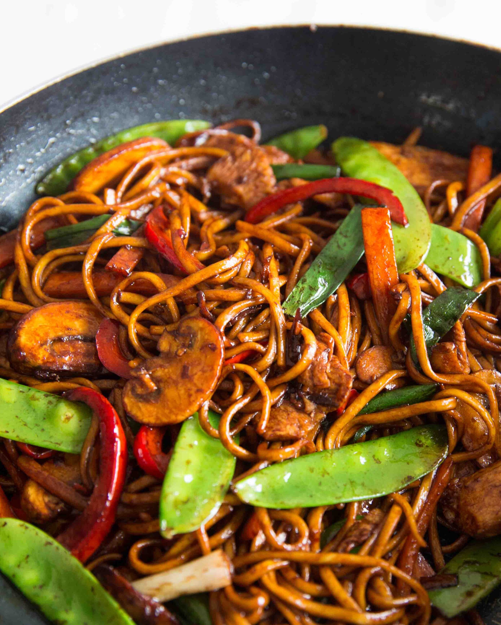 - Ordenar – Comience siempre con el pollo, dorando por ambos lados, luego retire de la sartén para terminar más tarde. Siempre agrego aromáticos una vez que tiro el pollo, lo suficiente como para liberar sus sabores pero no lo suficiente como para quemarlo. En el medio, considere qué verduras tardarán más en cocinarse. Pongo cosas como zanahorias, brócoli y pimientos al principio y vegetales más delgados y menos densos como cebolletas y brotes de soja al final. Poner siempre la pasta con la salsa al final.