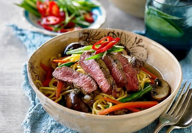 Cubra la pasta con rebanadas de cordero, cebolletas y pimienta, si lo desea.