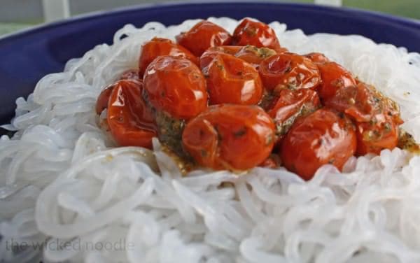 Eché mis fideos en una salsa asiática rápida que uso para mi receta de pierna de pollo asiática crujiente. Simplemente agregué los fideos milagrosos con un poco de salsa extra y quedó muy bien con el pollo. En la foto de arriba, hice una salsa rápida de tomate y ajo para servir encima; Quería ver cómo se comparan con los fideos italianos. No recomiendo esto ya que son muy diferentes y necesitas una salsa de sabor fuerte que cubra los fideos y permita que los sabores se absorban. Así que te recomiendo estos fideos milagrosos siempre y cuando los uses correctamente. ¡Puedes tomar algunos aquí o visitar tu mercado asiático local!
