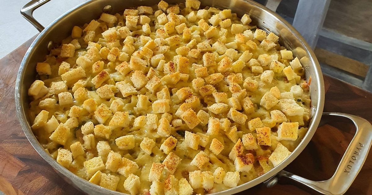 Coloque la mezcla en una cacerola de 6 tazas. Espolvorear con el queso restante. Hornee durante 20-25 minutos o hasta que estén doradas.