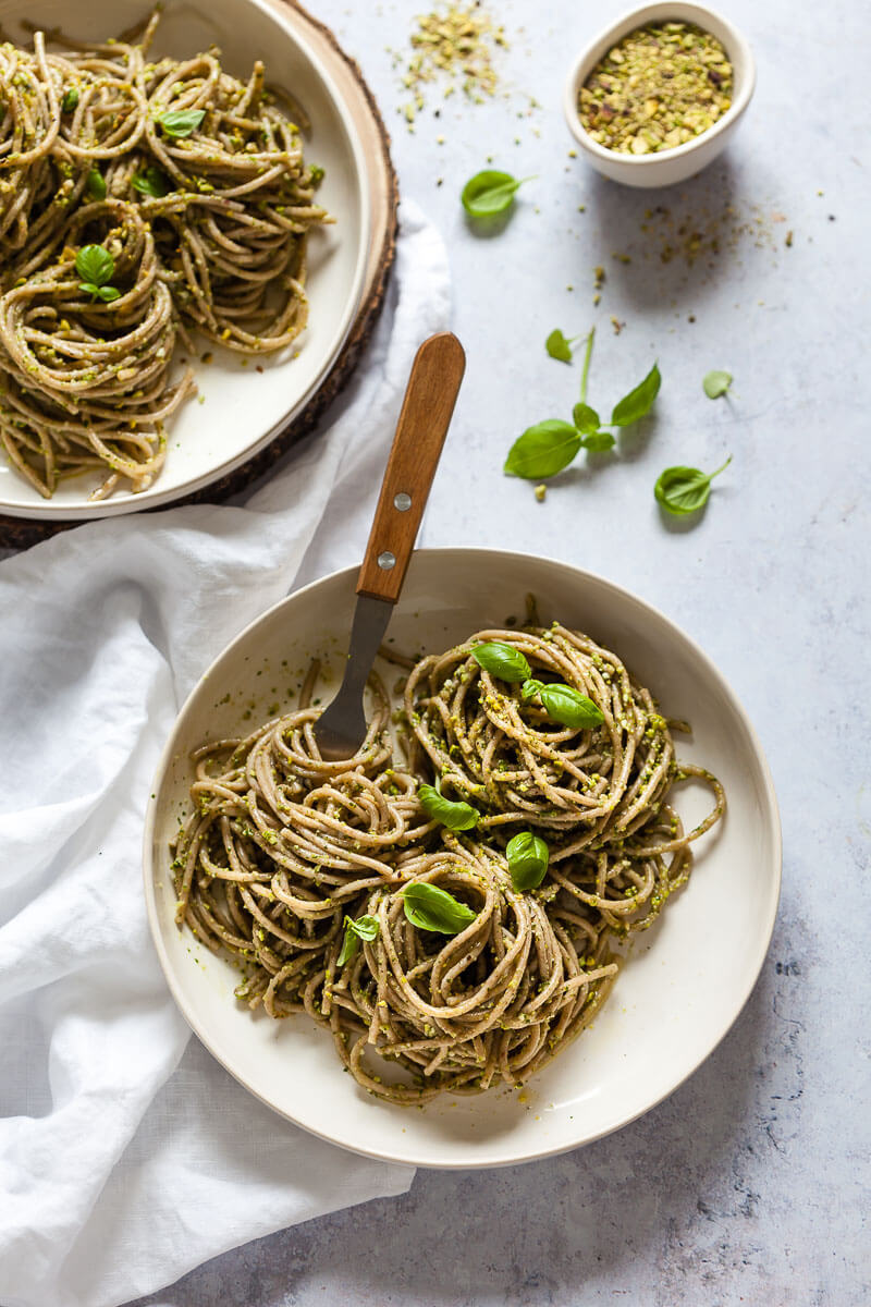 Para esta pasta vegana al pesto verde, decidimos combinar pistachos con una mezcla de albahaca suave y espinacas, simplemente porque descubrimos que el sabor puro de la albahaca es extraordinariamente fuerte. El uso de espinacas en lugar de la mitad de la albahaca funcionó perfectamente, brindando un sabor a pesto más delicado con un maravilloso toque de pistacho.