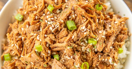 - Tape y cocine a temperatura BAJA durante 6-8 horas. Triture la carne de cerdo y sirva con arroz, papas o pasta. Adorne con cebollas verdes y semillas de sésamo, si lo desea.