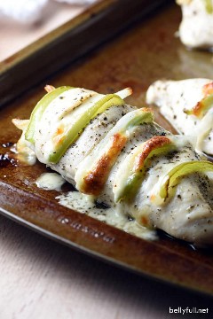 ¡Provolone, pimientos y cebollas se rellenan en rebanadas de pechuga de pollo cubiertas para este delicioso y húmedo filete de pollo bechamel!