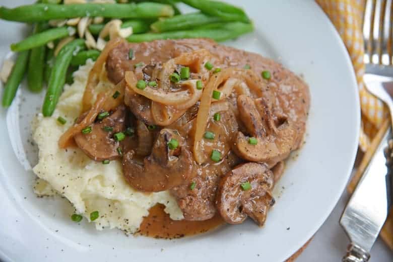 Así que aquí estoy buscando una receta de bistec cortado en cubitos y qué sabes… es muy similar a hacer un bistec Salisbury. Básicamente, un corte diferente de carne, pero ambos cocinados rápidamente en una sartén y luego rociados con una salsa marrón.