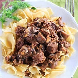 Ahora volvamos a este filete Stroganoff… Gracias a la olla de cocción lenta, la carne es increíblemente tierna, la salsa es rica sin ser pesada y llena de sabor. Me encanta servirlo con fideos de huevo con mantequilla, pero también puedes comerlo solo o con arroz. Sin duda una comida perfecta para los próximos días fríos de otoño.