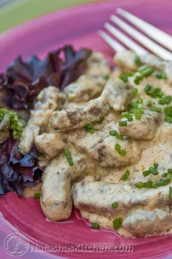 Esta es mi receta favorita de carne de res de todos los tiempos. Estaba tan emocionada cuando María compartió esto conmigo. Estaba igualmente emocionado de descubrir que no es tan difícil como pensaba (la carne a veces me intimida). Me complace compartir con ustedes esta clásica receta rusa. Vea mis notas en la sección de comentarios sobre cómo crear un lote más grande.