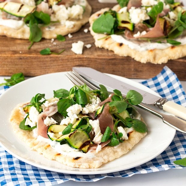 Ahora coloque las tiras de calabacín en la plancha durante un minuto (no es necesario girarlas). Cuando aparezcan las líneas carbonizadas, retíralas de la plancha y colócalas sobre los panecillos. Cubra con queso feta y jamón serrano y espolvoree con un poco más de sal y pimienta.