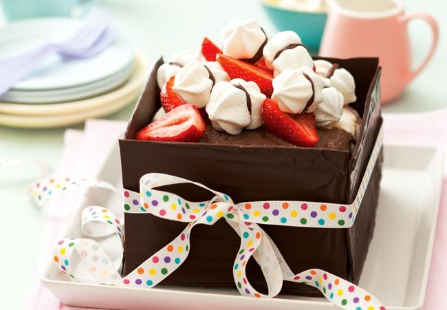Para esta receta necesitarás 1 metro de listón de 2 cm de ancho. Asegúrese de comprar un recipiente cuadrado de helado, no un recipiente rectangular. Para servir, retira la cinta y rompe el chocolate en trozos. Cortar el helado en rodajas y servir con chispas de chocolate, besos de merengue y fresas. Puedes guardar la tarta, sin los besos de merengue y las fresas, en el congelador con al menos 1 día de antelación.
