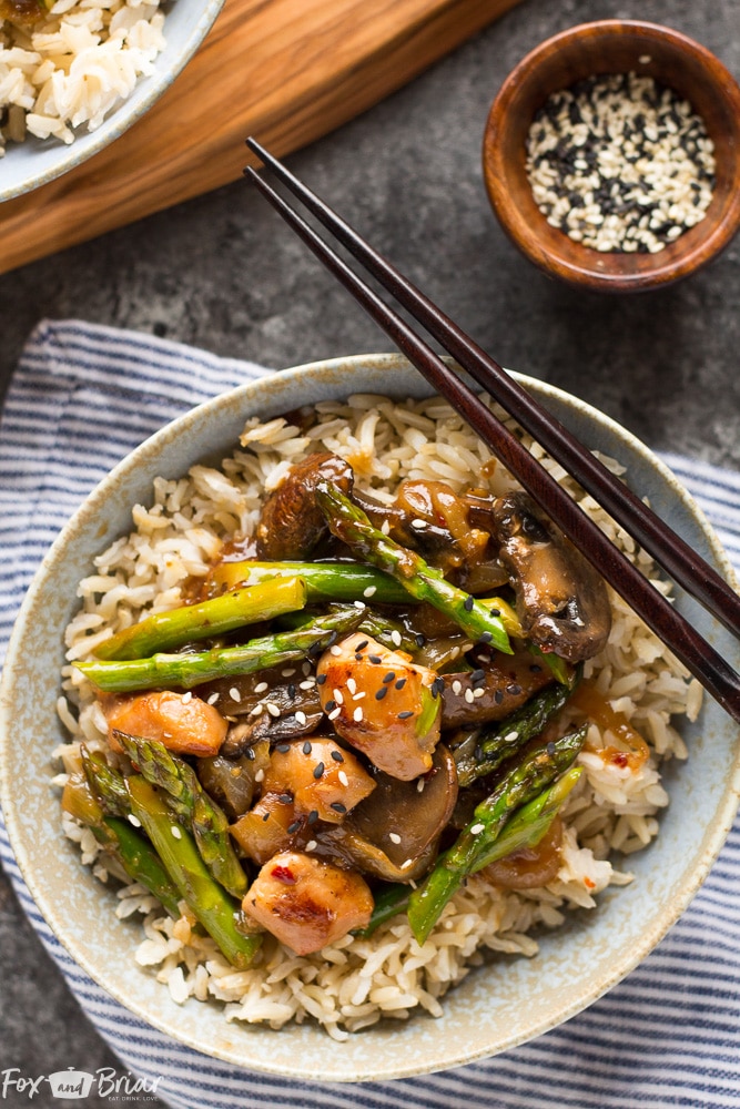 Me encanta preparar papas fritas para cenas rápidas y fáciles, como este pollo frito con limón y miel o este salteado de brócoli y camarones. Puede saltear con casi cualquier combinación de verduras y proteínas (¡o incluso solo verduras!), pero hoy estoy usando pollo, espárragos, champiñones y cebollas para este salteado de jengibre. Ginger Chicken es una combinación clásica de sabores, ¡realmente no puedes equivocarte aquí!